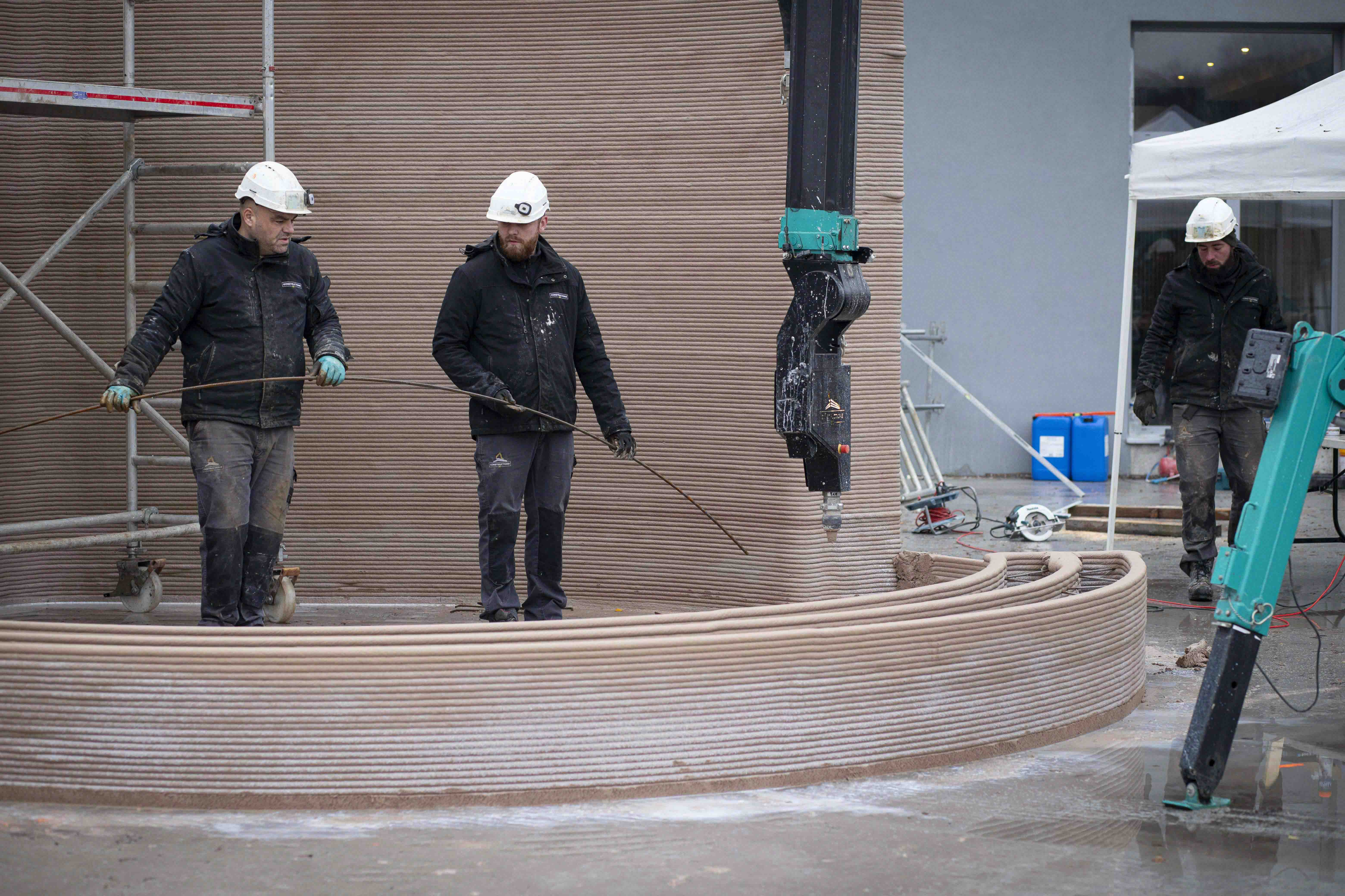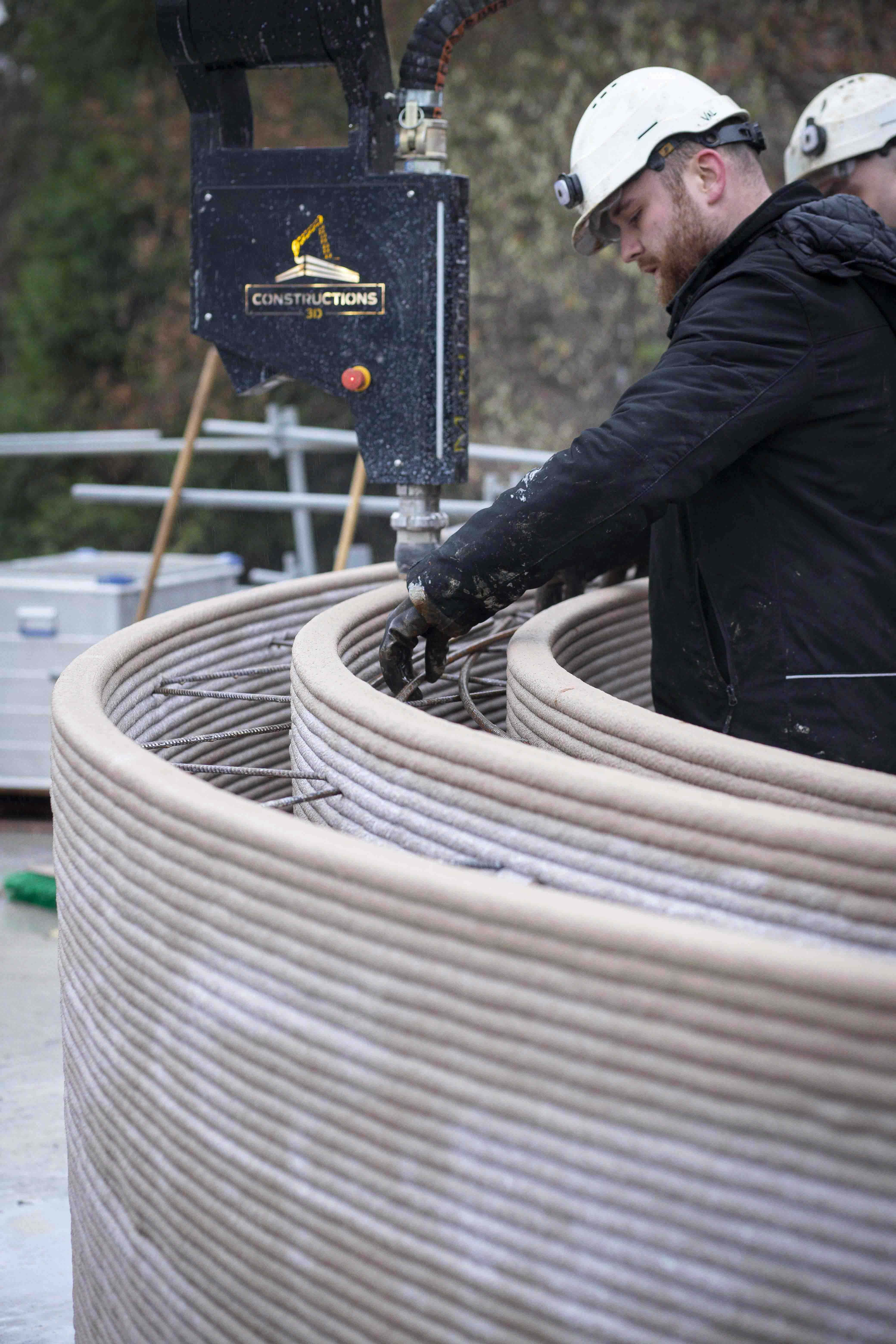 “There are several profiles: the person who converts the building plans into a 3D file, the one who operates the machine on-site, and the one who handles layout and setup. The first works on a computer, the second prepares the machine, positions it, and launches the print, and the third manages formwork, reinforcement, embeds, and elevation adjustments.”