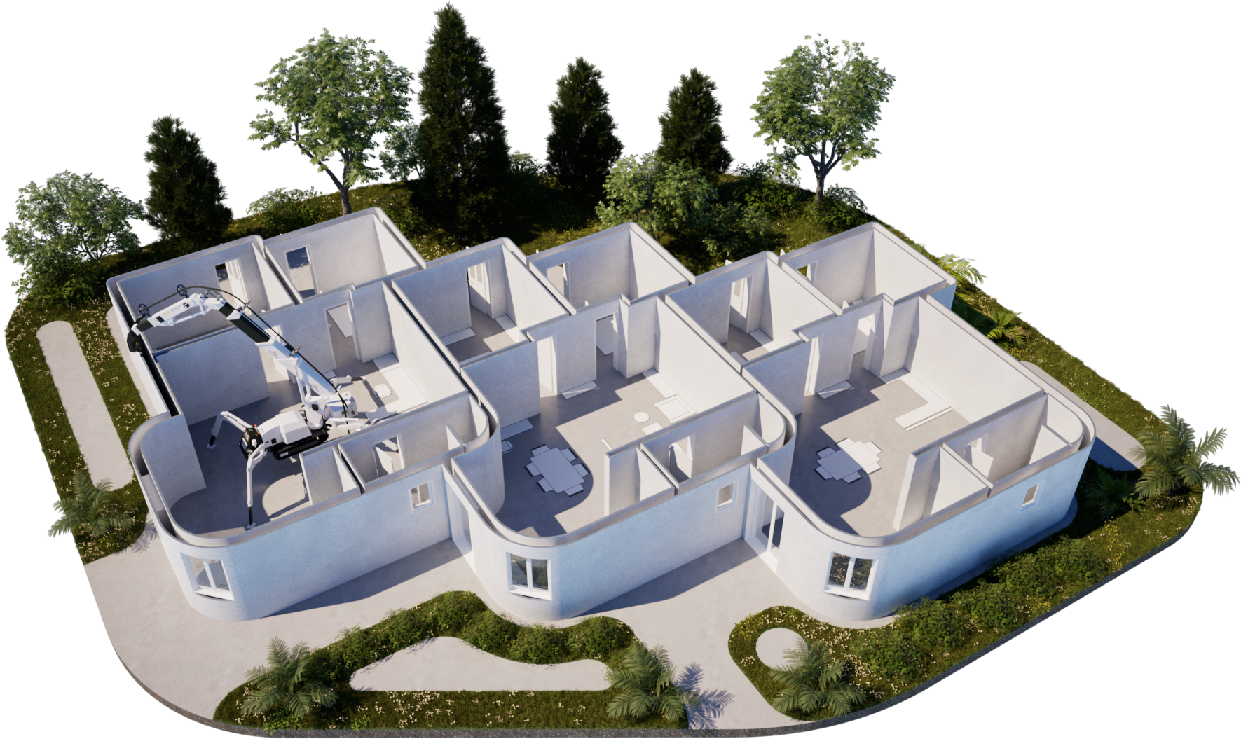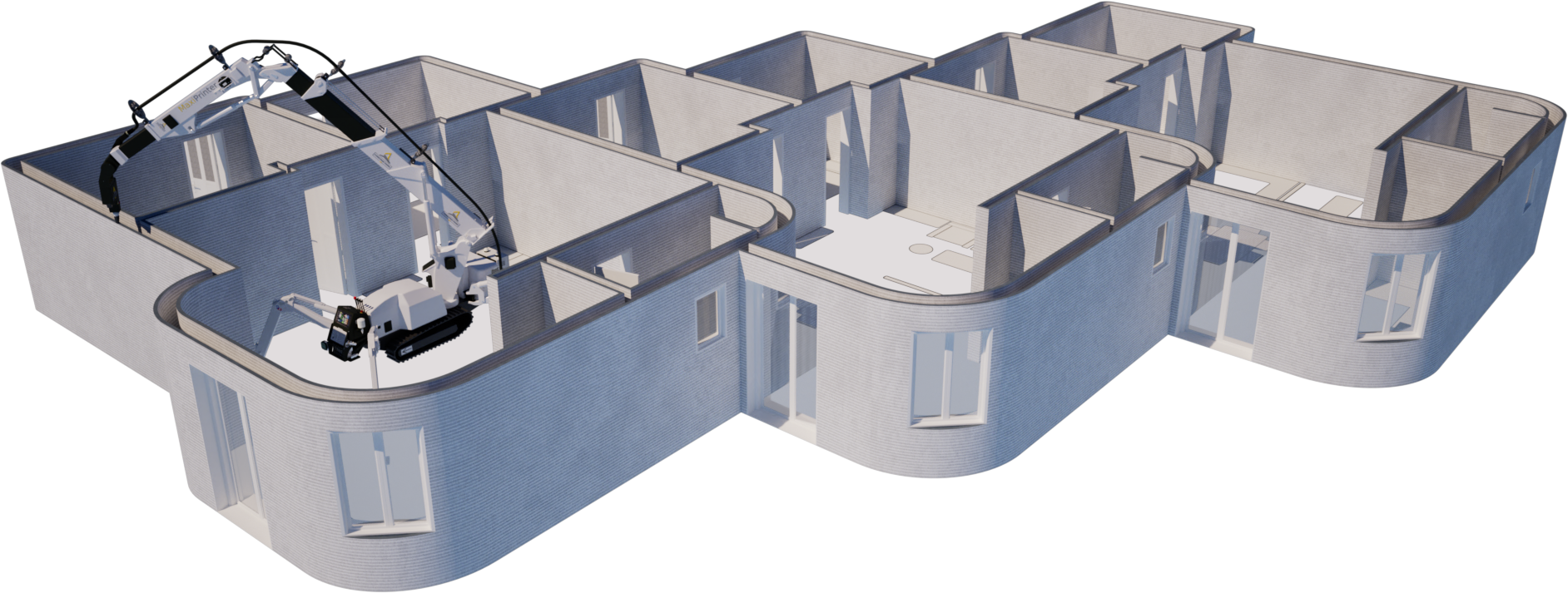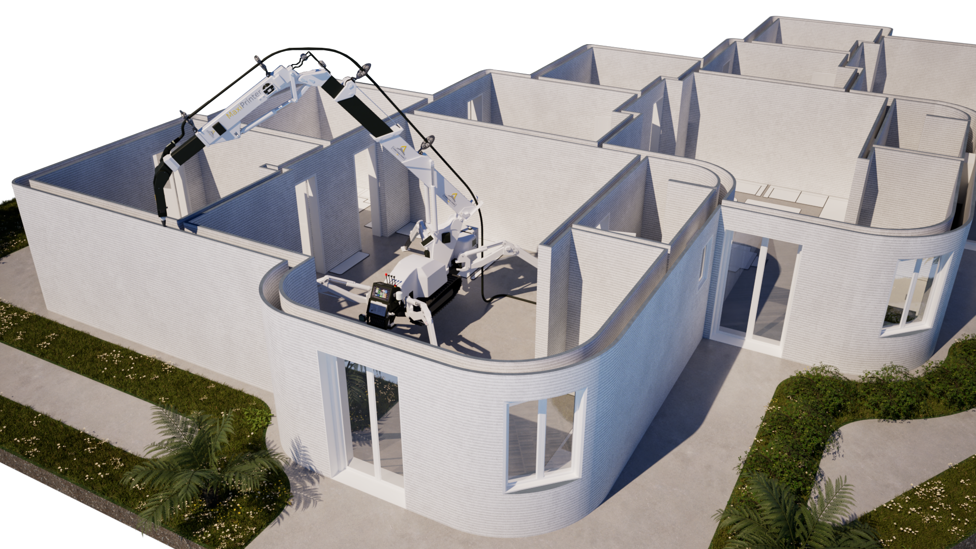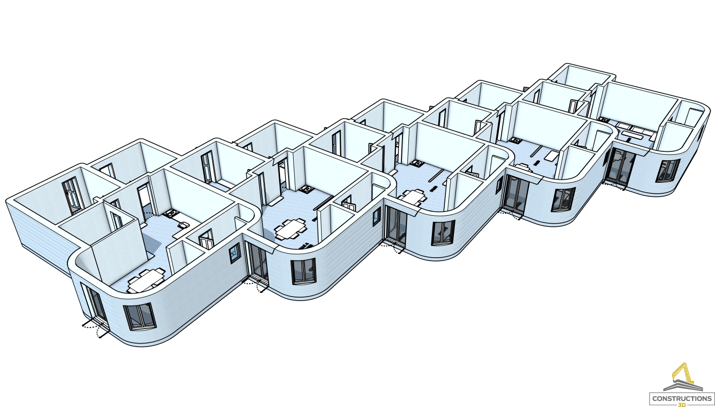 Le projet ReGen illustre parfaitement le potentiel de l’impression 3D béton appliquée à la reconstruction rapide et durable. Conçu par onstructions-3D, ce modèle regroupe une série de maisons mitoyennes d’environ 70 m² chacune, entièrement imprimables en une seule journée par unité grâce à la MaxiPrinter.