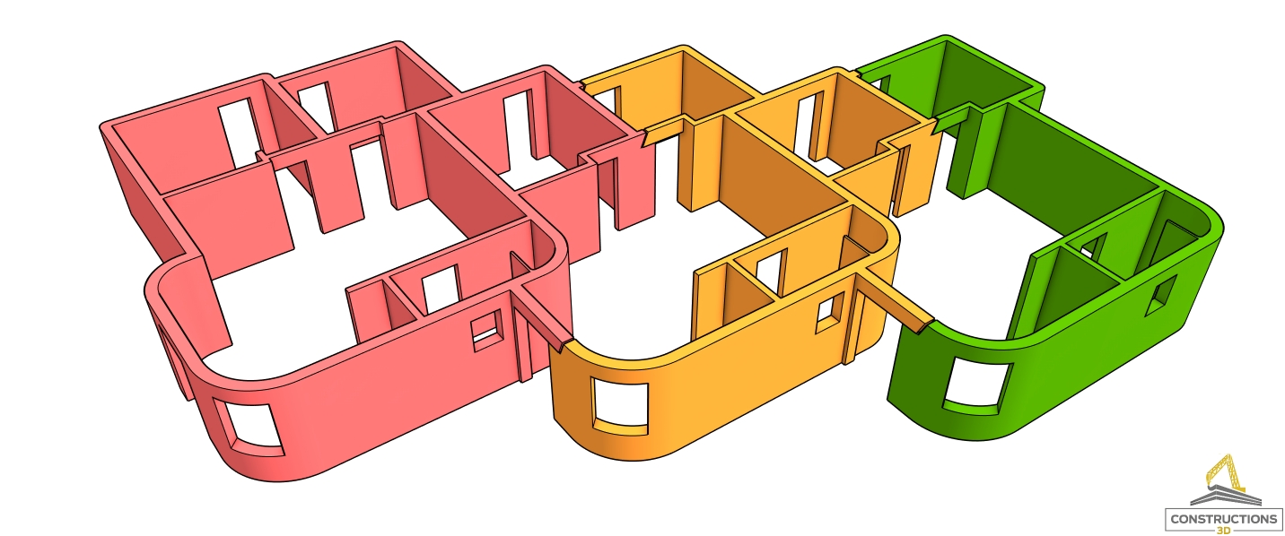 Le projet ReGen repose sur 3 types de modules : 2 modules d’extrémités et un module central. Le module central, qui est spécialement optimisé en termes de quantité de matériaux et de temps d'impression, peut être répliqué à l’infini pour réaliser autant de logements que nécessaire.